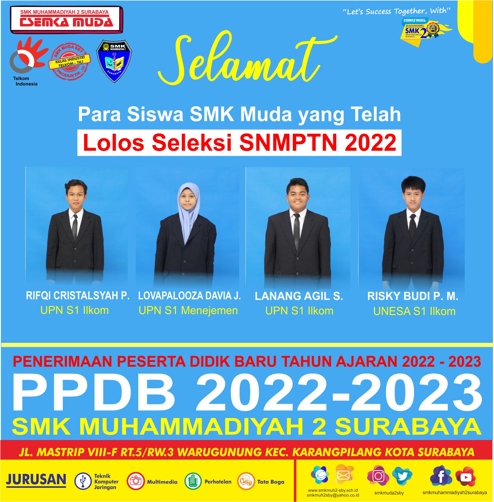 LOLOS SNMPTN 2022Alhamdhulillah sebanyak 4 siswa kelas 12 SMK Muhammadiyah 2 Surabaya Lolos dalam Seleksi SNMPTN 2022, adapun nama-nama siswa tersebut diantaranya; 1. Rifqi Cristalsyah Putra Kampus UPN Jurusan S1 Ilmu Komunikasi, 2. ... [ Baca Selengkapnya ]
